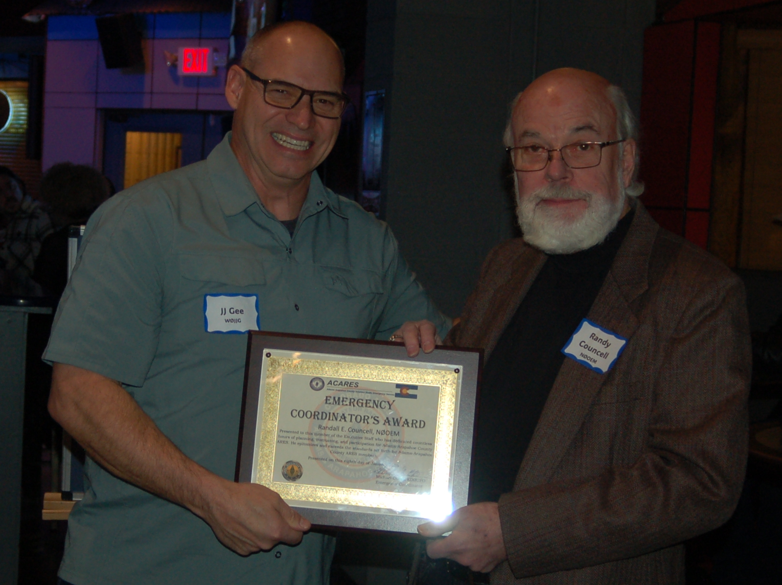 Randy Councell, NØOEM, was also recognized for his service with the Emergency Coordinator award presented by Michael Curta, KDØUFO, acknowledging his leadership and dedication to the membership of Adams-Arapahoe County ARES.